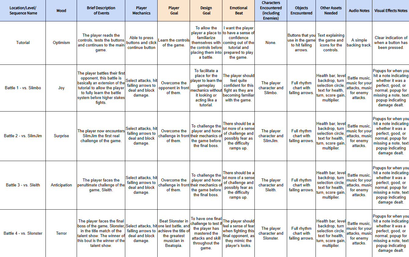 This week for our game me and my teammate created a macro chart to finalize goals, game length and what we wanted to achieve for our game. For the macro chart, we decided on having a total of 4 levels; 3 regular battles on increasingly difficult foes then 1 final boss to test the player's skills. We set out what we wanted to achieve for each level in terms of player goals, design goals and emotional beat. We also decided to add a small tutorial section for the player to learn the controls. After completing our macro chart and goals for the game set in stone with a clear view of what we wanted to do I was able to make some decent progress with the game itself. After establishing that we wanted to create levels for our game, instead of the initial idea of creating a roguelike styled game, allowed me to focus on the battle system refining it and blending both the rhythm game system and battle system.